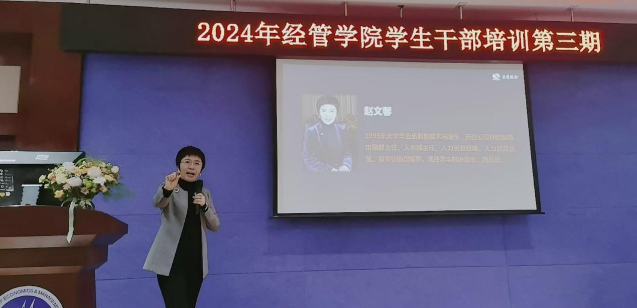 2024年12月11日,经管学院邀请1995届对外经济与贸易专业优秀校友、禾丰股份董事、副总裁赵文馨返校为50余名学生干部开展专题培训。赵文馨结合多年从业管理经验,围绕"新时代学生干部的全局思维与领导力培养"主题,通过经典案例解析职场沟通、团队协作与决策逻辑。她特别强调"专业底色+跨界视野"对职业发展的价值,并鼓励学弟学妹善用学院实践平台锤炼综合能力。此次培训为学院"校友讲坛计划"系列活动之一,旨在通过榜样力量赋能学生骨干成长。
